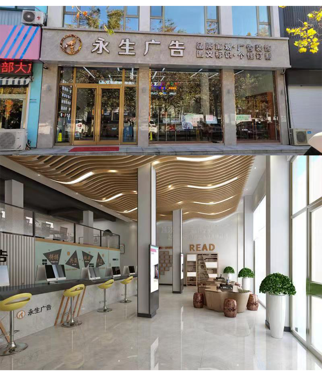 公司自有數(shù)碼沖床設(shè)備、500W光纖機(jī)、高精度大幅面噴繪機(jī)、寫真機(jī)、UV機(jī)、多種大小型雕刻機(jī)、吸塑機(jī)、全自動圍字機(jī)、自動開槽機(jī)、激光焊接機(jī)、拋光機(jī)等生產(chǎn)加工設(shè)備,擁有完善的設(shè)計團(tuán)隊、技術(shù)團(tuán)隊、施工團(tuán)隊、售后團(tuán)隊,可為廣大客戶提供室內(nèi)裝修、店招門頭、精神堡壘、黨建標(biāo)識、標(biāo)識標(biāo)牌、宣傳欄、LED顯示屏、警示標(biāo)識、精品字、證卡胸牌、證書獎杯、燈箱、桌牌、定制禮品、展具、噴印等多種專業(yè)廣告服務(wù)...